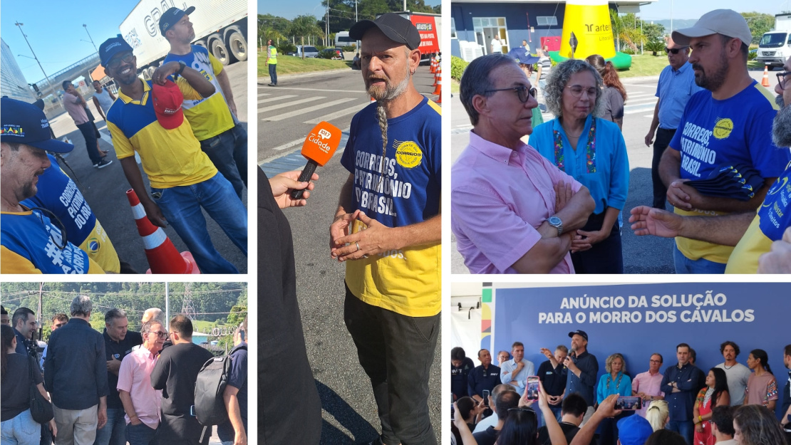 Com o objetivo de chamar a atenção do Governo Federal para a grave situação enfrentada pelos trabalhadores e trabalhadoras dos Correios, dirigentes do SINTECT/SC estiveram presentes, nesta quarta-feira, 28/1, no evento de anúncio da construção do túnel no Morro dos Cavalos, na BR-101, em Palhoça, na Grande Florianópolis.